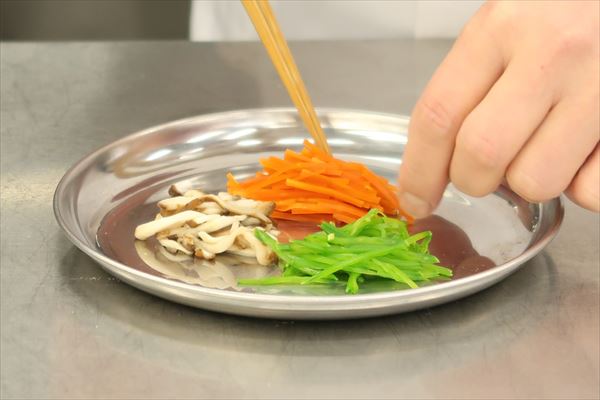 最後に切り分けたとき切り口に均等に野菜が見えるよう、せん切りは同じ大きさに。