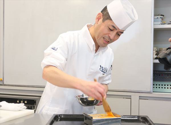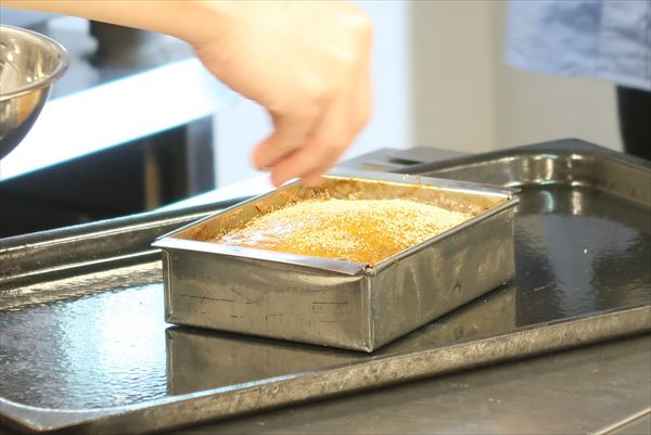 接着用の卵を塗るタイミングは、先生のこだわり。そこに一気にまぶしつけます。