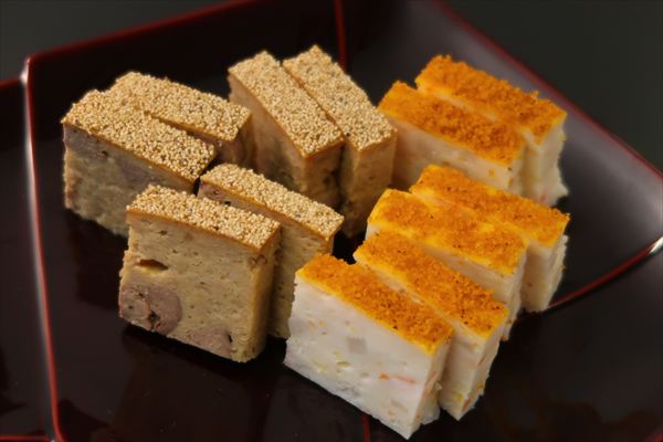 表の面に振るのは、鶏松風はおなじみのケシの実で香ばしく。海老松風には、煎りウニを振って風味をつけて。