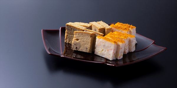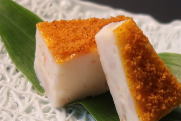 海老松風には、切り方を変えた海老や、細かく切った蓮根を加えて食感の楽しさを出しました。見た目も華やか。