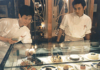 | 「天使の羽」というテーマですが、私たちパティシエ(製菓技術者)は、だからといって天使をそのままアメ細工で作ったりはしないんです。今回も台本をよく読んで「軽くふわっとした」イメージをあらわそうと、デザインもケーキの味も工夫してみました。デコレーションは、やはりウエディングケーキなので、ホワイトチョコレートの白を主体にして、軽さを出すためにエヴァンターユ(扇)型に成形して、ふんわり、豪華に飾りました。 また、ケーキ自体もホワイトチョコレート風味ではありますが、生クリームベースのクリームにしてしまうとちょっと重くなるので、卵白を混ぜ込んだシブーストクリーム(クレーム・シブースト)をベースにして、酸味のあるフランボワーズのゼリーがアクセントです。 それから、ドラマの演出として、エイジ君や子供たちが手で食べるシーンがあるので、スポンジ生地を何層かはさんで手でつかみやすいようにしてあります。デコレーションの仕上げとしては、幸せに向かって飛び立って行く、新郎新婦への祝福という意味もこめて、アメ細工の羽を2枚だけのせてみました。 |