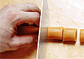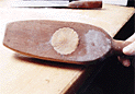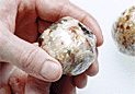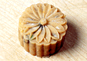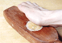 | 4.皮の中央に飴をのせる。 | 5.生地を持ち上げるようにして餡を包み、手の平で丸めて形を整える。 | 6.少量の打ち粉をした月餅の型に包み口を上にして入れ、手の平でしっかり押さえる。 |