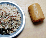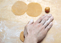 | 1. 五仁火腿飴を45gずつに分ける。ラップで包みまとめる。 | 2.生地を12gに分割する。 | 3.打ち粉をした麺棒にとり、手の平で押さえて直径6cmの円形に伸ばす。 |