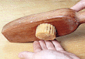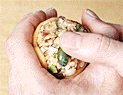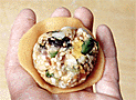| 7.型を横にして四方を軽く叩いて、型との間に隙間をつくる。 | 8.形を崩さないように、手の平に取り出す。 | 9.かたどった物。焼くと生地が膨らむため、この段階では餡が透けて見えるほど生地を薄くする。 |