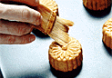 | 10.月餅の表面の粉を刷毛で取り除き、オーブンプレートに並べる。表面に霧を吹き、200℃のオーブンで焼く。 | 11.表面が色づき始めれば取り出し、艶出しを薄く塗り、更に4〜5分間焼く。 | 12.薄茶色に色づけば取り出し、一日置いてしっとりしてから食す。 |