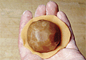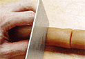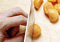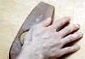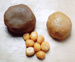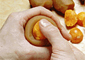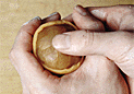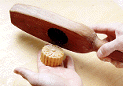 | 7.少量の打ち粉をした月餅の型に包み口を上にして入れ、手の平でしっかり押さえる。 | 8.型を横にして四方を軽く叩いて、型との間に隙間を作る。 | 9.形を崩さないように取り出す。 |