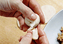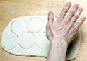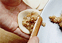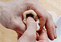 | 1.水油酥皮を3mm厚さに伸ばして、 直径7cmの円形の型で抜く。 | 2.生地に餡25gをのせへらで押しつけるように形を整える。 | 3.右手の親指で餡を押さえつけながら、 左手で皮の周囲を狭めていく。 |