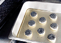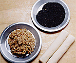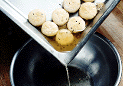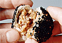 | 7.オーブンプレートに胡麻のついていない面(包み口の側)を下にして並べる。160℃に熱した油を加えてオーブンで焼く。裏返し、胡麻のついた面も焼く。 | 8.6 両面が焼ければ、油を取り除く。更に約5分間、油ぎれをよくするために焼く。 | 9.出来上がり。 |