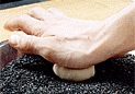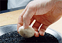 | 4.生地は包み終わりをしっかりと閉じる。折り込み生地のため、加熱すると包み口が開きやすい。不要な包み終わりの生地をちぎり取る。 | 5.包み口を上にして持ち、下半分に卵白をつけ黒胡麻の上に置く。 | 6.手の平で押さえて、直径5cm・厚さ2cmの大きさに形を整える。 |