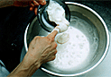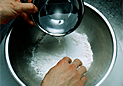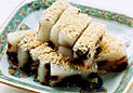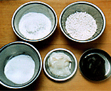 (材料)8人分 上新粉………………………………………100g 白玉粉………………………………………100g 水……………………………………………180g グラニュー糖………………………………80g ラード………………………………………40g あずき餡……………………………………適量 煎り胡麻……………………………………適量