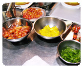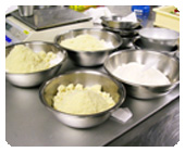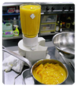(2)卵黄と砂糖を合わせてすり混ぜ、沸かしたピューレを加えて、泡だて器で攪拌しながら80℃になるまで炊く。 |