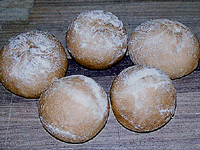 *成形・生地を軽く丸め直し、手のひらで押さえて折るようにしてフットボール形にする。閉じ目が下になるよう布の上で発酵。・丸め直した生地に、粉をつけて薄く円盤に伸ばした5grの生地をのせ、中央を指で突く。5grの生地が下になるようにして布の上で発酵。 *発酵 50〜60” 30〜32℃の所で乾燥しないようにする。(2倍程膨らむ) *焼成 25” ・生地に切り込みを入れて、230℃のオーブンにスチームを入れ焼き上げる。・閉じ目を上にして、230℃のオーブンにスチームを入れて焼き上げる。