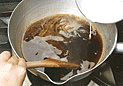 6.木杓子で混ぜながら水溶き葛粉を少しづつ加える。