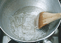 水につけていた寒天を引き上げ、別に計った水300ccといっしょに鍋に入れ、煮溶かす。