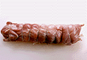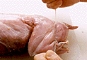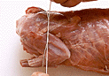 前後の脚を折りたたんで胴に添わせ、糸で縛って固定する。胴全体にも4、5カ所糸をかける。