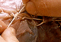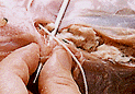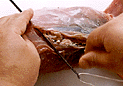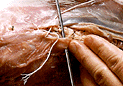 胸の方から縫い始め、最後まで縫ったら、縫い目を針ですくって頭の方に糸を戻し、最初の糸の端と結ぶ。