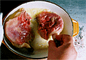 もも肉はバターを熱したグラタン皿に入れ、焼き油をかけながら中まで火を通す。