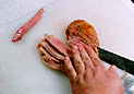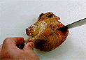 鴨を縛っている糸をはずし、もも肉をはずす。
