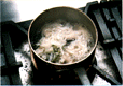 2.薄切りにした玉ねぎ、パセリ、タイム、ローリエ、ニンニクと一緒にうなぎを鍋に入れ、塩、こしょうして白ワインをひたひたに注ぐ。しばらく煮て、うなぎに火を通す。 |