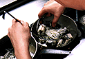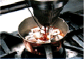 | 7.うなぎを温かいパイケースに盛りつける。シャンピニョンを縁に並べ、白子を中央にこんもり盛る。 |