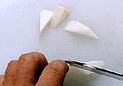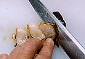 | 1.身は2mm幅に切る。貝柱は大きければ切っておく。 |