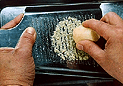 | 4.しょうがは皮をむき、円を描くようにすりおろす。ガーゼに包んで絞りやすくしておく。 |