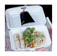 水で溶いた米粉を蒸し器の上でクレープ状にに広げて火を通し、餃子のように具を詰めて折り重ねる。このままだとお互いに生地がくっつくので、油をまぶしておく。 ↓ これにもやしと刻んだレタス、フライにしたにんにくを振りかけ、甘口のタレを添えてくれる。