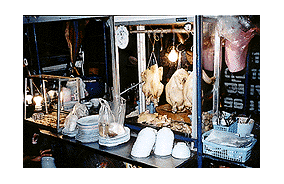 | 時間も遅くなったので、マンション近くの屋台街で夜食をとることにした。聞けば、屋台は朝から開いているところもあるが、夜の方が店舗数も多いそうだ。今日のように週末ともなると、さらに遅い時間の方が人の入りも増えて来るらしい。 | |