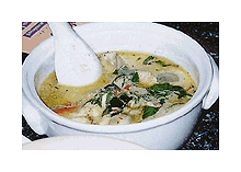とても辛いグリーン・カレーだが、この辛味の加減がバランスよくでき上がっている。日本では見かけないマクアクロープ(小粒の丸なす)の歯切れ良い感触が、たまらなくこの料理を引き立てている。もちろん、ご飯にかけていただく。 | |