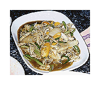 「蟹のカレー炒め煮」で、とても食べやすくできている。大衆食堂などでは殻付の蟹を丸ごと使って作られるが、この店では蒸した蟹肉を使って仕上げている。野菜としては、玉ねぎと青葱、それにタイのセロリ(かなり細い)とオレンジ色の生唐辛子(あまり辛くない)を加えている。これにカレー粉と水を加えて、少し煮込んである。これにも、ご飯を添える。 | |