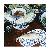 民芸調のレストランで、入口を入ると地方の食器類が陳列されている。店内には歴代王室の家族の写真が壁一面に飾られている。外人客が多いのだろう、メニューはタイ語と英語で書かれたものが準備されている。