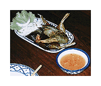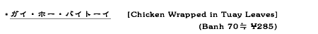 一口大に切った鶏肉に下味をつけ(オイスターソースや砂糖、シーユー・ダムなど)、バイトーイ(タコヤシの葉)で包んでパーム油で揚げている。カリッとした葉を除くと、ほどよく火の通った鶏肉の香りが食欲を満たす。ナムチムは、チリソースとケチャップをベースにしたものを水で薄めたようなもので、甘辛さが目立つ。