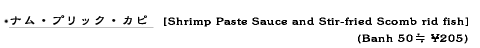 カピをベースにした辛味と塩味の強い味噌。これに生野菜として、輪切りのきゅうりとささげ、キャベツ、トゥアプー(シカクマメで蟹の足の形に似た野菜)が添えられる。さらにプラーシークン(鰺の一種で、一度蒸したものを油で焼いている)が別添えで運ばれてくる。味噌は野菜につけて食べるのだが、ちょっと塩味が濃過ぎる。魚は塩の塩梅がちょうどよい。