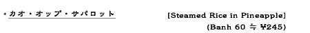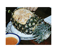 パイナップルとカシュナッツ、鶏胸肉、輪切りのウインナーソーセージを入れた混ぜご飯を作り、甘く味つけしている。これを中をくり抜いたパイナップルのケースに詰め、蓋をしてオーブンで蒸し焼きにする。食卓に出す前に蓋をはずして、肉のそぼろを振りかける。実際は、オーブンに入れずに温めたものを詰めているように思う。それに中に入っているソーセージは、味を損なっているように思う。