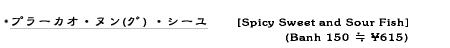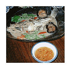 両面に切り目を入れたハタ科の魚に干ししいたけと生のプリック(辛くない)、シーユー・カオとマナオの汁を加えて蒸し、セロリ(タイのものは細い)を添えている。ナムチムはナムプラーにマナオと少量の砂糖、刻んだプリッキーヌ、水を混ぜたもの。魚は非常にあっさりとしていて、アコウの身に似ている。