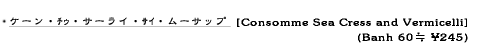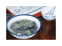 生海苔と春雨、豚肉の団子、ざく切りにしたセロリ、青ねぎを鶏スープで煮込み、塩、こしょうで味を調えただけのスープ。これにフライにしたにんにくを振りかけている。非常にあっさりしていて、辛味は全くない。日本の吸い物のような味わいがした。
