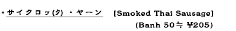 タイ東北部イサーン地方特産のソーセージで、豚挽き肉をベースに蒸したもち米を加え、にんにくとナムプラー、マナオなどで味つけされている。これを乾かしてから、じっくりと焼き上げたもの。独特な香りがあり、付け合わせには生のキャベツとエシャロット、プリッキーヌ、甘酢漬けの生姜、ローストした薄皮付きのピーナッツが添えられている。