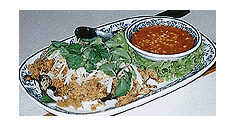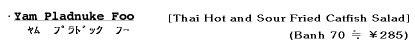 ナマズの身をボロボロにほぐして唐揚げにしたサラダ。皮もカリカリに揚げて添えてある。これに青いマンゴ(あるいは青いパパイヤ)の細切りと薄切りのエシャロット、輪切りのタクライ、ローストしたピーナッツを振りかけ、ミントの葉が添えられている。ナムチムは、刻んだタクライとマナオの汁、刻んだ生の唐辛子、にんにく、ナムプラーなどを混ぜたもの。