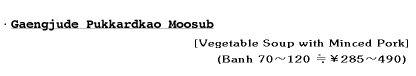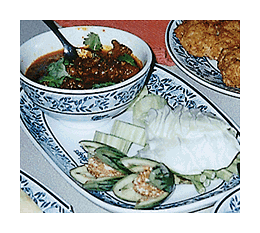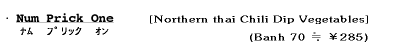 タイ北部の料理で、とても辛い肉味噌を野菜につけて食べるもの。この辛い肉味噌は、刻んだ玉ねぎとにんにくを豚挽き肉と一緒に炒め、トマトとすりつぶした唐辛子を加えて煮込み、砂糖とナムプラーで味を調えたもので、温かいうちに生野菜につけて食べる方がうまい。野菜は、きゅうりとキャベツ、ささげ、それに生の小なすが添えられている。
