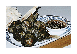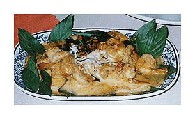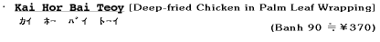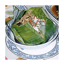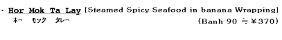 一口大に切ったイカやえび、白身魚をココナッツミルクとナムプラーで下味をつける。これにクラチャイ(生姜の仲間で臭み消し)やバージル、唐辛子などを加えて混ぜ、バナナの葉で包んで蒸した料理。