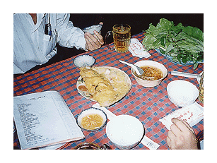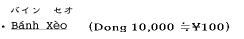 ↓ この上に、小えび(殻付)と薄切りの豚肉ともやし、玉ねぎをたっぷりとのせ、油を振りかけ2つ折りにして焼き上げたベトナム版お好み焼き。 タレは、ヌクマムに短い千切りにした大根とにんじん、薄切りの塩漬けらっきょ、酢、砂糖、水を混ぜたもの。これに好みで酢漬けの刻んだ赤生唐辛子(種も入っている)を加える。 食べ方は、サラダ菜等にバインセオを適当に切り分けたものをのせ、ミントの葉や他の香草類をのせて手で包む。これを上記のタレに浸けて食べる。