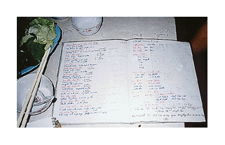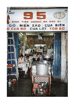 | | 店の住所がそのまま食堂名になっている。ベトナムでは店名に番地の番号をそのままつけただけのものや、住所をそのままつけたりする事が多いらしい。この食堂は車やバイクの激しい通りの交差点に面しているため、排ガスの匂いが強いのでなるべく店の奥に入り込んで食事をする事をすすめる。 地元では有名な蟹料理の専門店で、旨くて安いためか客の入りが絶えない。料理を取りしきっているのは50代のオバサンで、この店のオーナーらしい。それにサーヴィスの女の子が2人と、サーヴィス兼調理補助の男の子が2人いるだけ。店の中にクーラーがないので、料理は店の入口で作っている。客席はテーブルが4つで約20席。それに2階には予約席で同じくらいの席数があるらしい。 メニューはベトナム語の下に英語と仏語が書かれているので分かりやすいが、必ずしも自分で想像しているものと同じものが出てくるかは、料理が運ばれてくるまでわからない。 |