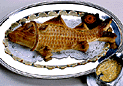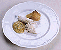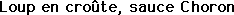 上面のパイを切り取ってはずし、すずきの上身をはずす。めいめいの皿に、切り分けた上身、ムース、パイを盛りつけ、ソースを添える。