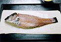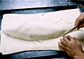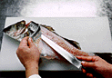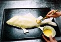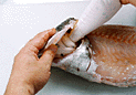 すずきの皮を尾の方から頭に向ってはがす。尾びれの形を整え、その他のひれを切り取る。背びれは両側から切り込みを入れて小骨といっしょに取り除く。