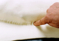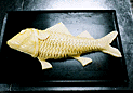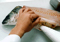 残りの生地を切り抜いて目、胸びれなどをつくり、ドリュールを塗ってはりつける。うろこのもようをつける。口金で半円形の刻み目を入れ、生地を引き起こすようにするとよい。