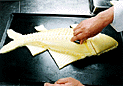 ナイフに打ち粉をしてすずきの周りのパイ生地をえらや尾びれの形を残して切り取る。胴の部分の生地にシクテする(成形したパイ生地の周囲にナイフの刃先の背側で斜めに浅く切り目を入れること。焼いたときにふくらみやすく、きれいに仕上がる)。