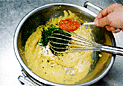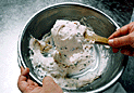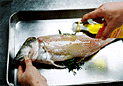 すずきにはさんだ香草を取り除き、表面を軽くぬぐう。ムースを絞り出し袋に入れ、すずきの腹の中に絞り入れる。