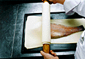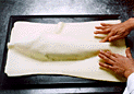 パイ生地をすずきの大きさに合わせて2枚のばす。1枚をオーブンプレートに敷き、その上にすずきをのせる。