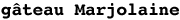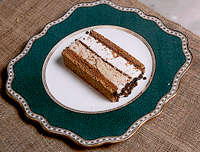 | 7.焼いた生地1枚に4のガナッシュを薄く塗り、もう1枚の生地ではさむ。これを二組つくる。そのうちの一組に5のクリームをたっぷりのせる。1枚残っている何も塗っていない生地をのせ、6のクリームをたっぷりのせ、もう一組のガナッシュをはさんだ生地をのせる。側面に6のクリームを塗り、チョコレート(フレーク状のもの)をまぶしつける。上面にピラミッドの形を切り抜いた紙を置き、粉砂糖を振って模様をつける。 |