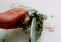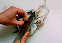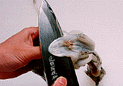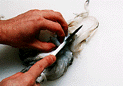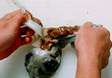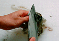 | 21.Cut into the round semi-translucent parts covering the innards. | 22.Insert both thumbs between the innards and the flesh covering them. | 23.Move your fingertips toward the innards to separate them from the meat. |
